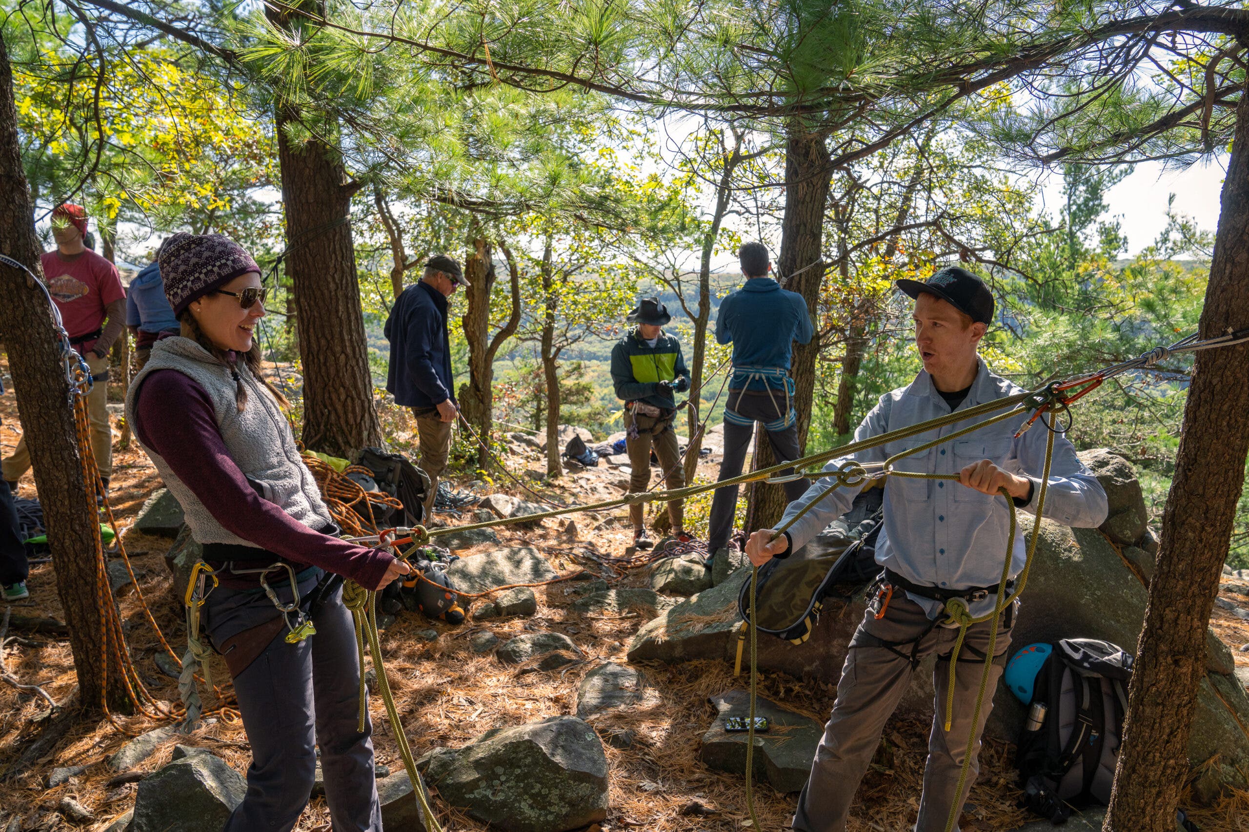 “I came to the [Devil’s Lake] Craggin Classic for the first time a few years ago so I could learn how to make good top rope anchors.” participant Jackie Neu said as she hiked up the trail to the East Rampart (the busiest crag at the lake), “I had learned the basics from friends but wanted the reassurance of having learned from a professional as well.” This year’s event had an emphasis on anchors with three different clinics being all about how to build safe top rope anchors. The top of the 60 to 70-foot cliff band is easily accessible by trail to create anchors from trees, boulders, and crack features, making it the perfect spot to practice these techniques.