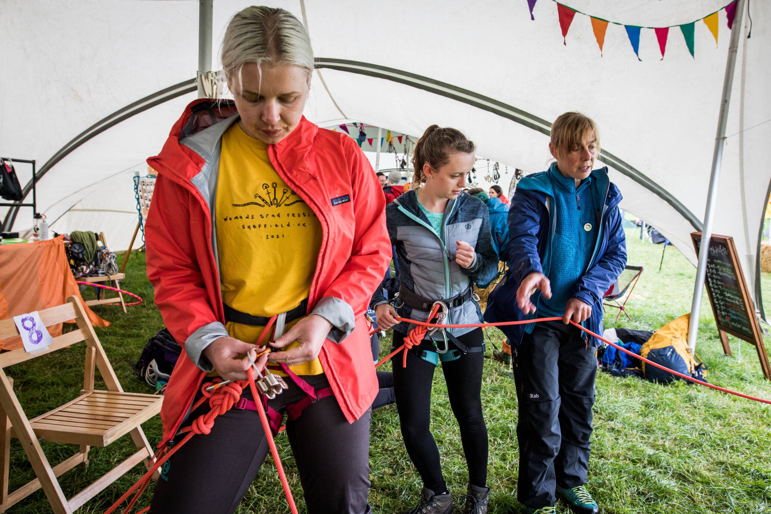 Morning yoga sessions loosened up learners and leaders alike for a big day on the rock, and dinner was enjoyed around the fire pits with “haybale sessions”: ice-breaker activities and sustainability discussions from the festival’s sponsors. After a fallow year in 2020 owing to the Covid-19 pandemic, the festival’s themes of Connection and Unity seemed especially important. Indeed, despite the “typical English weather”, friends new and old swapped stories of their days upon their return to basecamp.