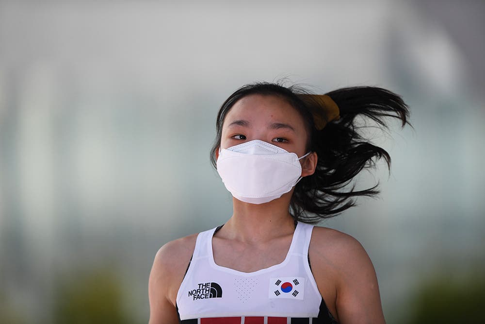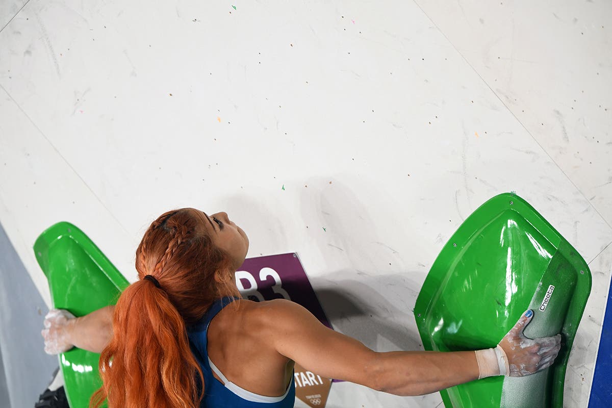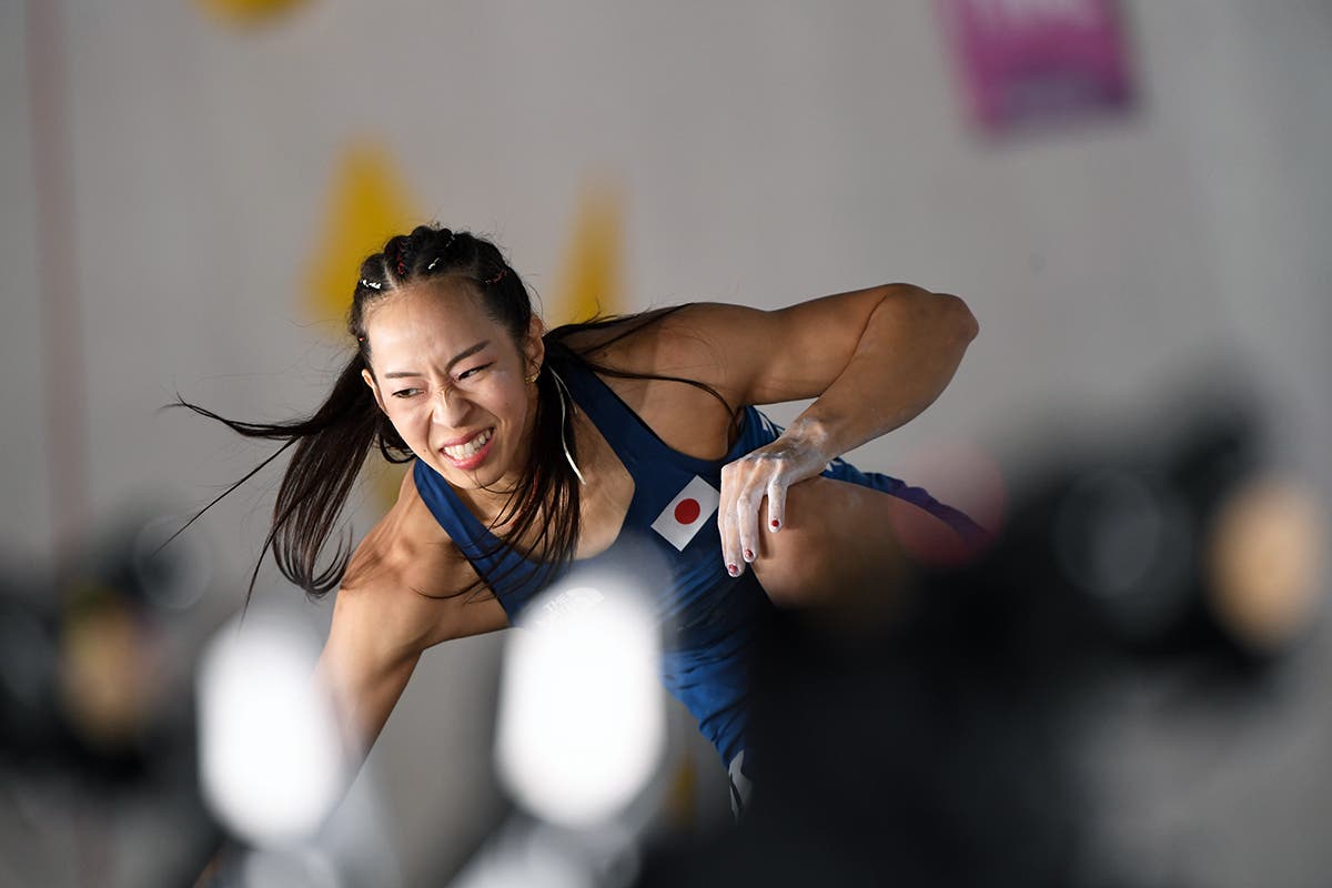 Miho Nokona of Japan, airborne on the Boulder finals during the Sport Climbing event at the 2020 Olympics. She would place third in Boulder, and would go on to take the Silver medal. (Photo: Ryu Voelkel)