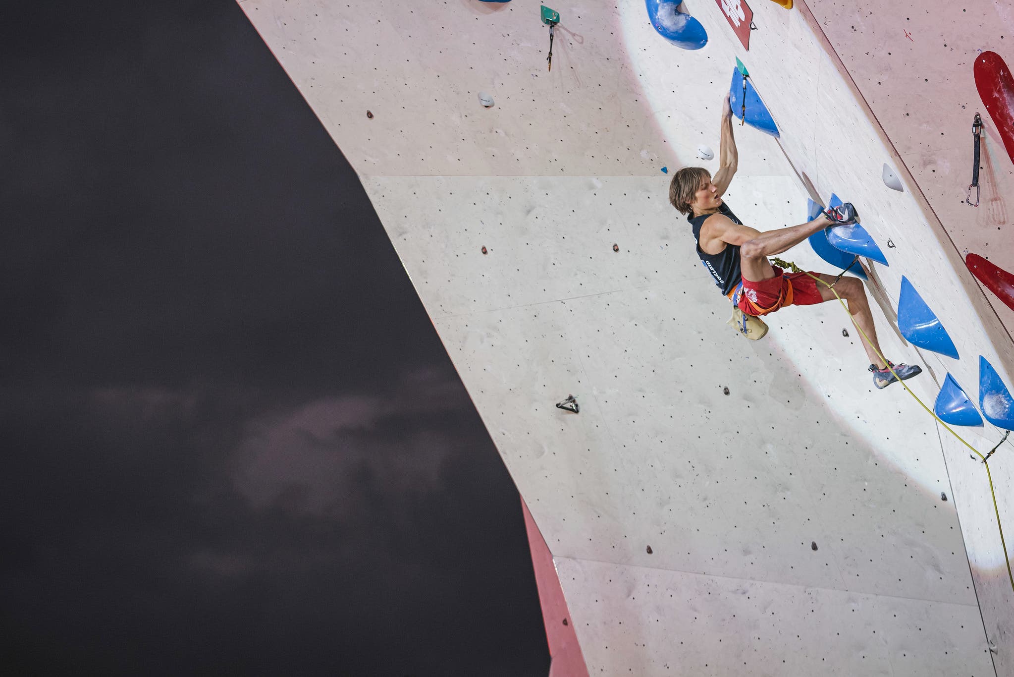 Hojer is approximately six feet tall, making him one of the tallest competitors in the men’s field. He can use his height to reach handholds that would be out of reach for many other competitors. But Hojer is also a very dynamic climber, thanks in part to the fact that the German team was one of the first national squads to embrace parkour exercises and unique cross-training in a comprehensive way years ago.