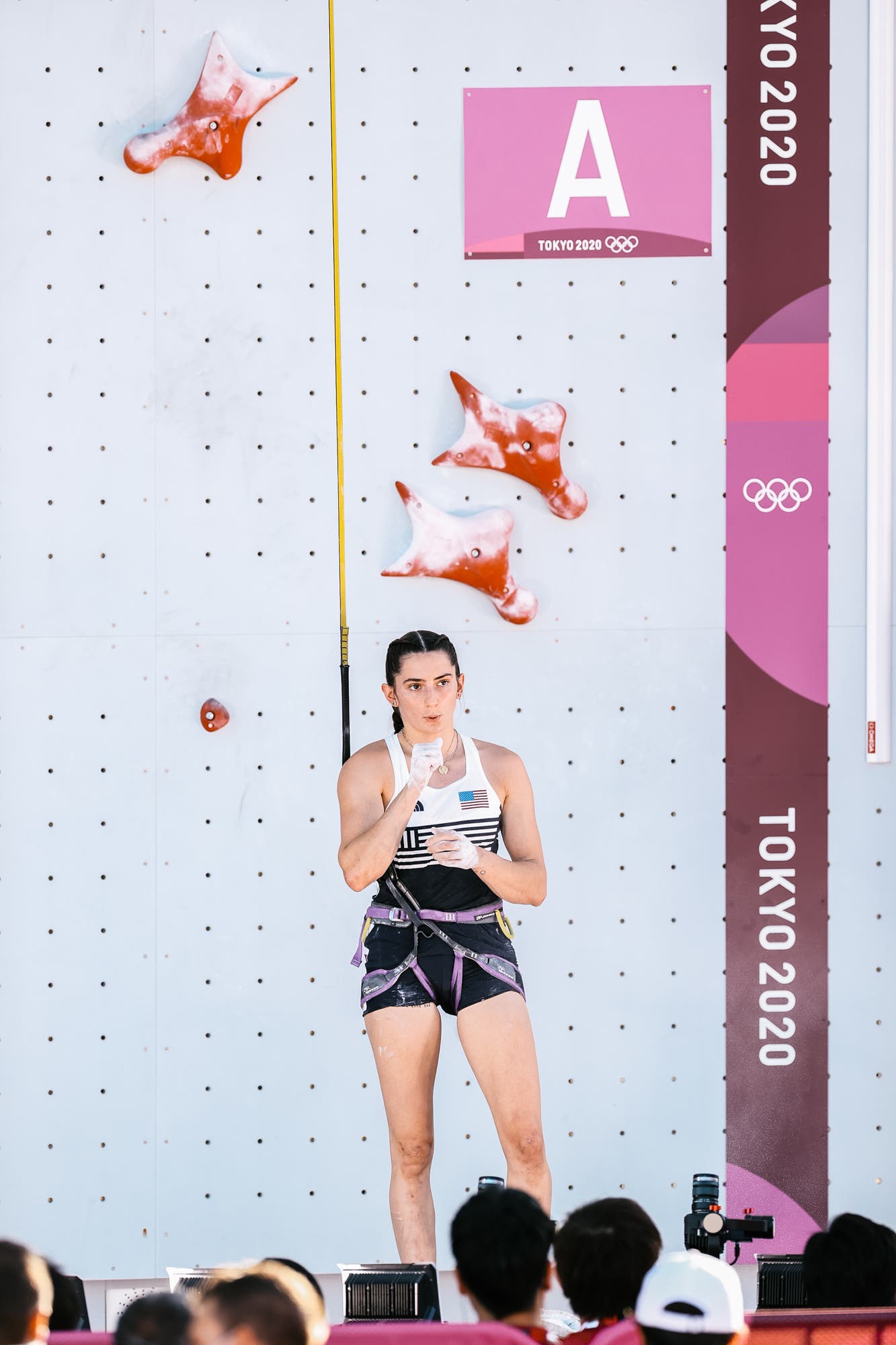 Brooke Raboutou was the first American to launch off, racing on the right lane against Alannah Yip, of Canada. Yip broke her personal best and Brooke nabbed a 8.81. On Brooke’s second burn, she clipped in then closed her eyes and took a breath. She wanted better and she got better. Raboutou got a clean 8.67, though with a small slip. Yip got a 7.99 on her second, breaking the sub-8 barrier. Prior to Tokyo, 9.16 was Yip’s best before. So yea, Yip is in her element.