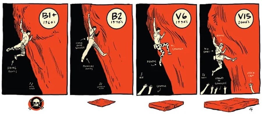 1. Before Gill proposed the B-system in 1958, problems largely went ungraded—bouldering had been seen as a fun, mildly competitive diversion or “practice climbing” for roped objectives. “As far as I know, we had no bouldering grading system but used the grades we applied to climbs,” says Royal Robbins of the problems he and other California pioneers did at Stoney Point, Yosemite, and elsewhere. “If they were hard enough, we called them 5.9+. It was just training for the real, big stuff.” Gill also used route climbing’s Yosemite Decimal System until he began pulling moves harder than 5.9.