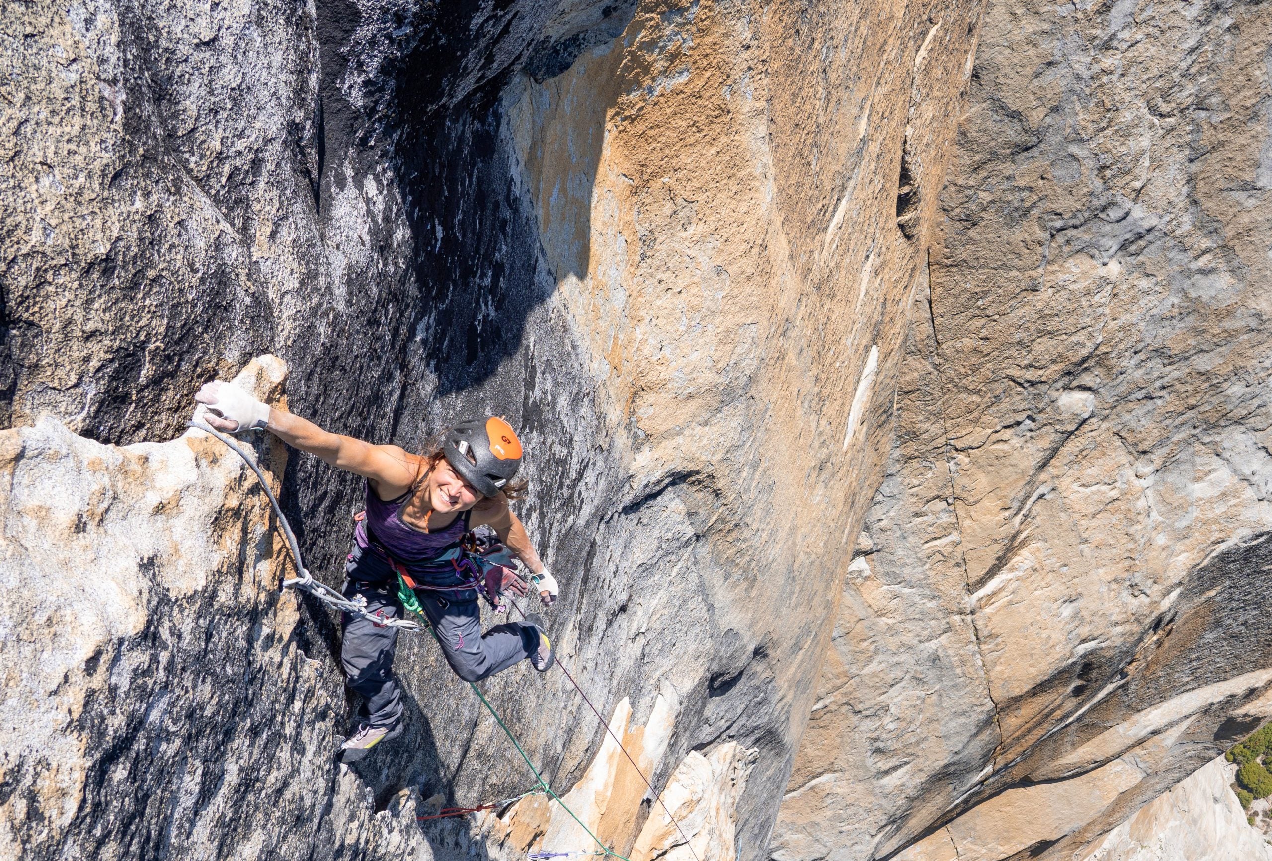 Three pitches higher, on pitch 19, came the route’s first crux, the delicate step-down, at 5.13a. Because the downclimb crux is positioned in the middle of the 3,000-foot wall, Hodgins had only briefly been able to preview this section. During her ground-up ascent, she required two days to redpoint the downclimb.