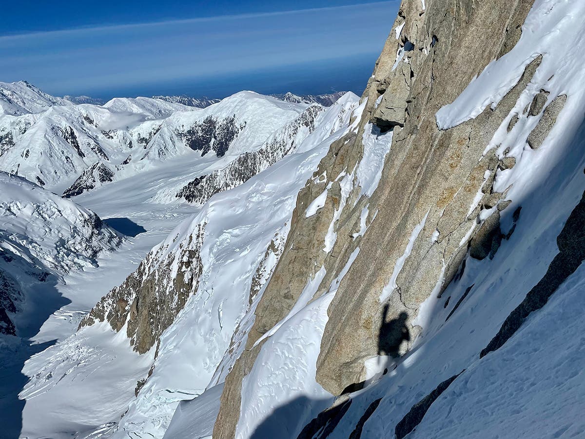 Astorga took an uber-minimalist kit up the wall, with only a 35mm line and two ice screws to be used in case of retreat, climbing in ski boots with her skis on her back. “It’s really a perfect route,” she said. “It was all well within my ability, I wouldn’t have been up there alone otherwise. The first 1,500 feet is all ice climbing up the Japanese Couloir, which is a real trash chute, you want to climb it when it’s cold. Above that, it’s mixed, primarily rock with some ice. Never long, sustained climbing, but a lot of 30- to 40-foot sections with breaks in between.”