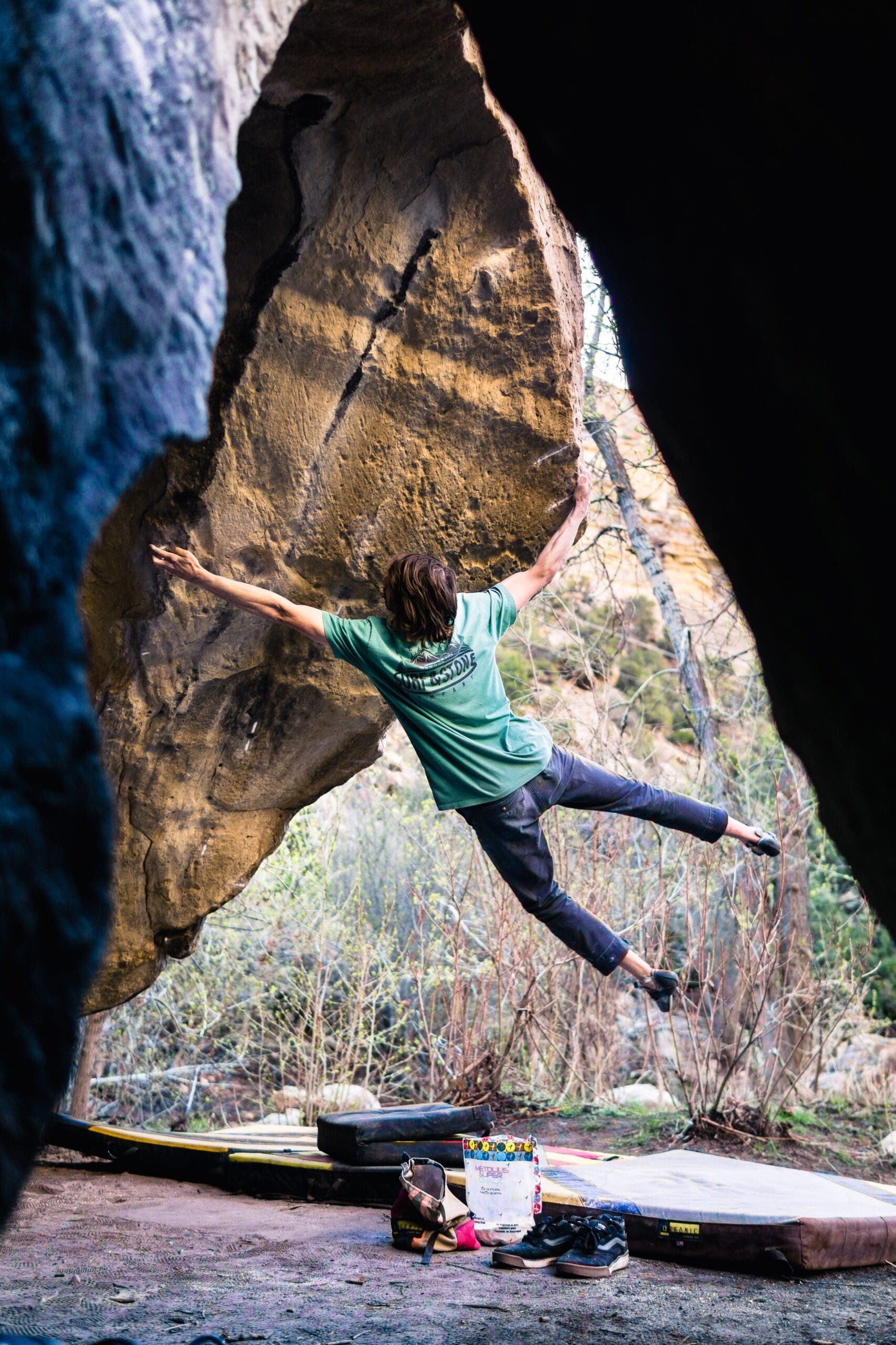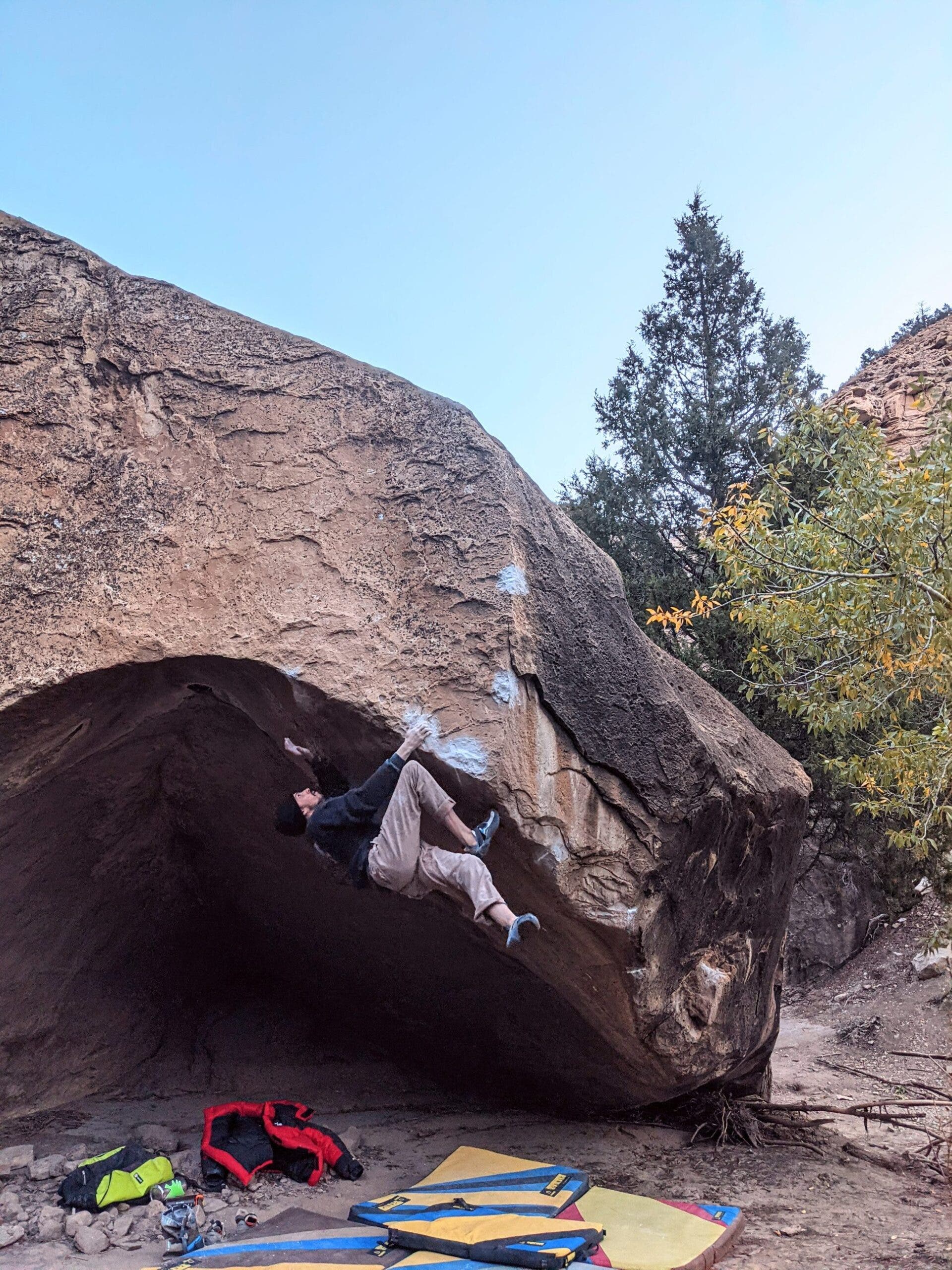 My first session, in the spring of 2018, I tried it alone for three or four hours and only managed to do the top, which is about V8. I came close to sticking a couple of the hard moves and had a general idea of how they would go, but I was nowhere close to having a workable sequence. I came back a few weeks later with Jimmy Webb, and we were able to do several of the moves in isolation but were missing a lot of pieces to the puzzle and weren’t able to make any promising links. I left it alone for the rest of that season. I returned in the fall of 2018 and put in two more sessions. Nothing felt different than the following season; I was stumped. In the spring of 2019, I returned stronger and more determined. On my 6th session I did all of the moves. At that point, I knew it was possible and the obsession began. After three more days, on my 9th session, I climbed it in two pieces. At the time I felt so close to a send and was extremely frustrated that I couldn’t make it past the 3rd move.