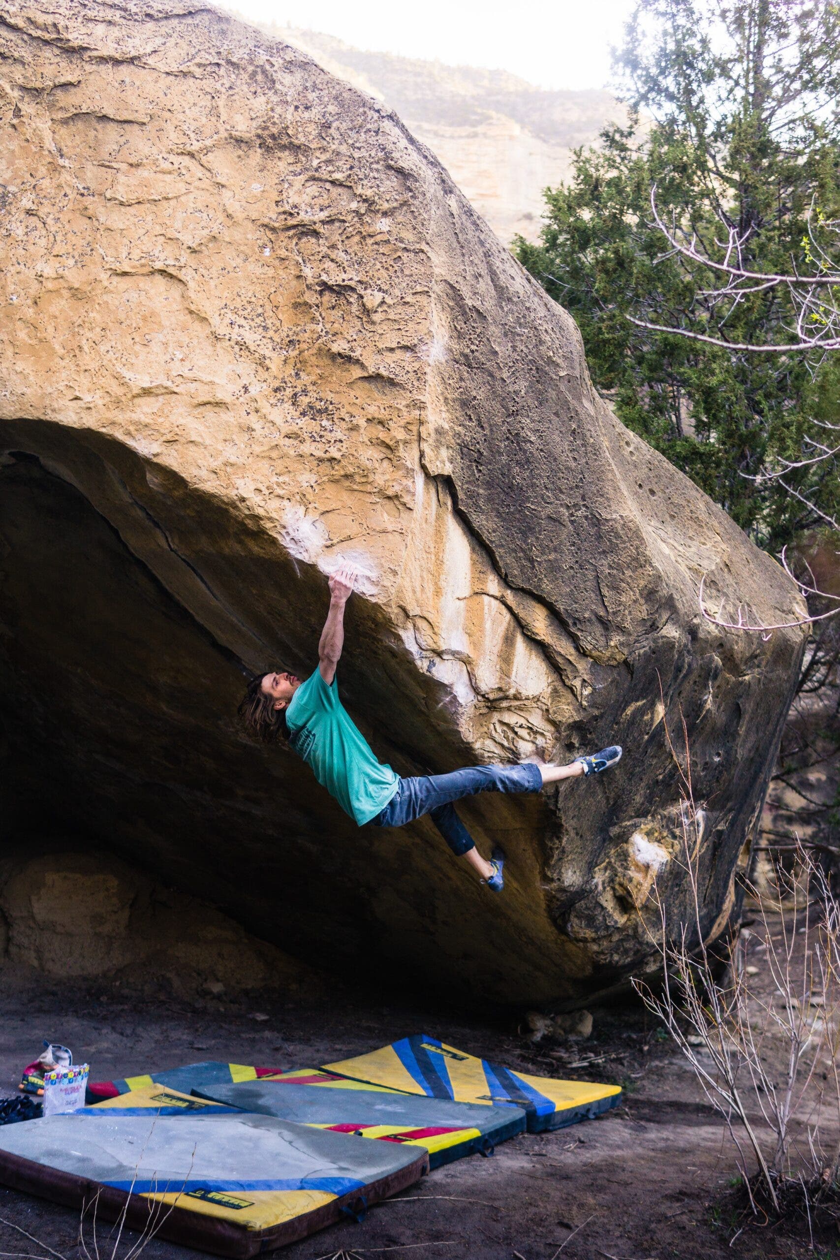 Justin Wood, a Salt Lake local, showed me the project in March 2018. We ran over and looked at it with just a chalk bag. I felt some holds and I was immediately psyched. It’s a stunning feature with wide compression moves—the stuff of dreams for me. When I’m searching for projects, this is exactly the type of climb I’m looking for. I went back to the car, grabbed pads, and went straight to work.