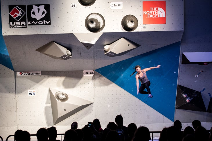 Zach Galla leaping for the finish on M4. Unfortunately he couldn’t land this dyno, ending an impressive run at his first Open Nationals.