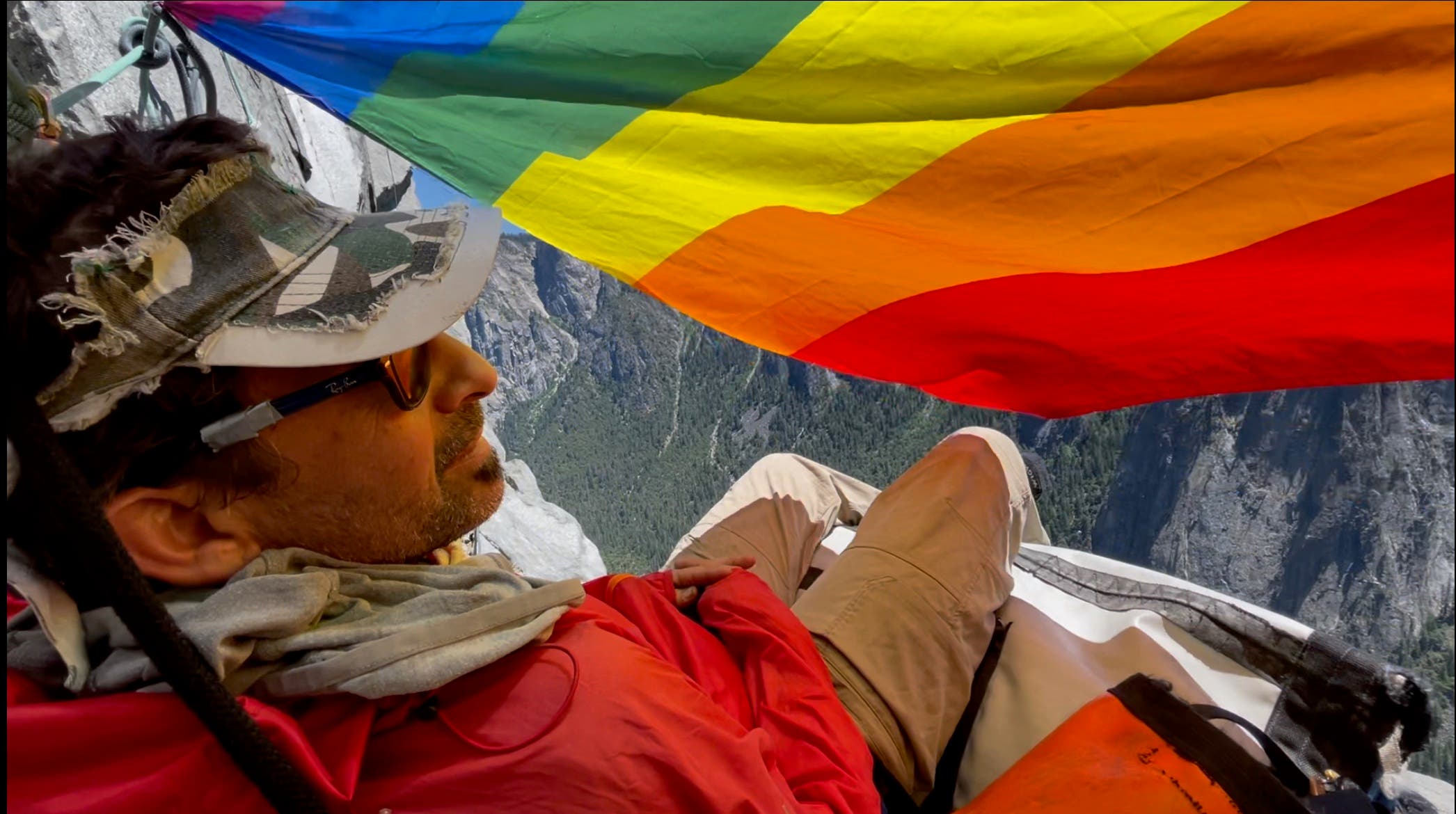 Shortly after starting down, they mistakenly went west instead of east, finding themselves on the obscure aid route Grape Race (5.9 A3). At that point they either had to climb back up or continue and try to return to the Nose. Instead of committing down the wall in the waning daylight, they strung one hammock over the other at a belay, bunk-bed style, with Alexander taking the top.