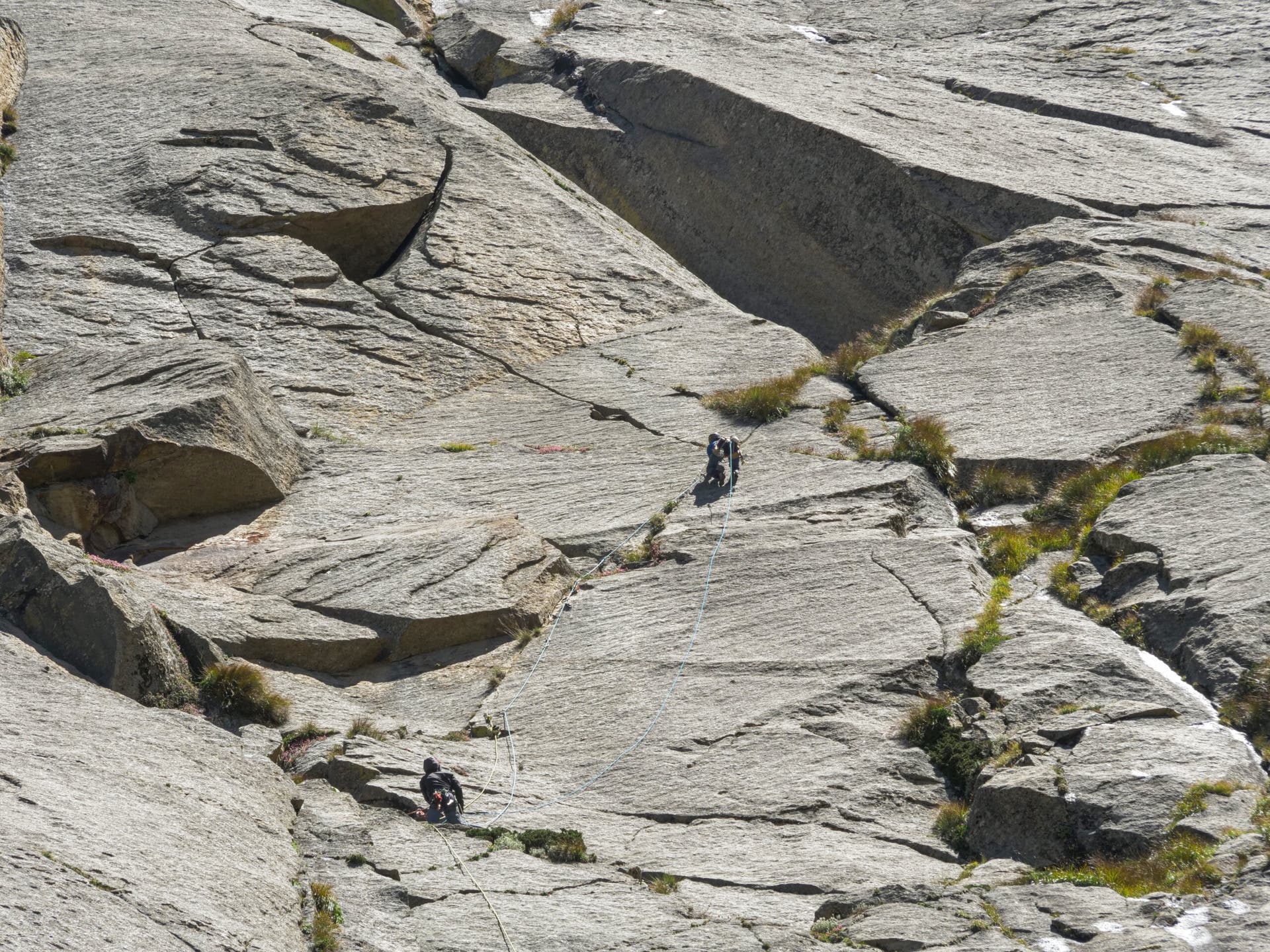 The team was struck with brutal weather for most of the expedition. They reported temperatures only a few degrees above freezing on the wall most days, with regular wind and rain, and often found their rope and gear encrusted with ice when jumaring back up each morning. Out of 23 days camped below Shoshala, the team only got in 11 days of climbing. “I can’t even say these days were good climbing days,” admitted Patil, “because at times on those days we’d jumar up several hundred meters for a few hours, clean one pitch, and then it’d start raining and we’d go back down.”