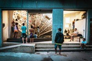 Brazil ranks ninth in the world for worst income inequality, which makes a sport like climbing financially inaccessible to most people. Compounding the problem, rock gyms, which in the United States serve as an entry point into the sport, are scarce. As of this writing there are two small gyms in Rio, not including CEU, each with little roped climbing. Both are in expensive neighborhoods with limited access by public transportation. But CEU and its little bouldering wall tucked up a narrow alley in Rocinha? It’s free to anyone that can get there.“Here, even more so than in the U.S.,” Andrew said, “climbing is an elitist sport. If you’re poor, you don’t climb. All the climbers here tend to be white and middle class. I wanted to shake that up and give access to the sport, the lifestyle … the self esteem, self awareness, health, and environmental awareness that is just so deeply rooted in climbing.”