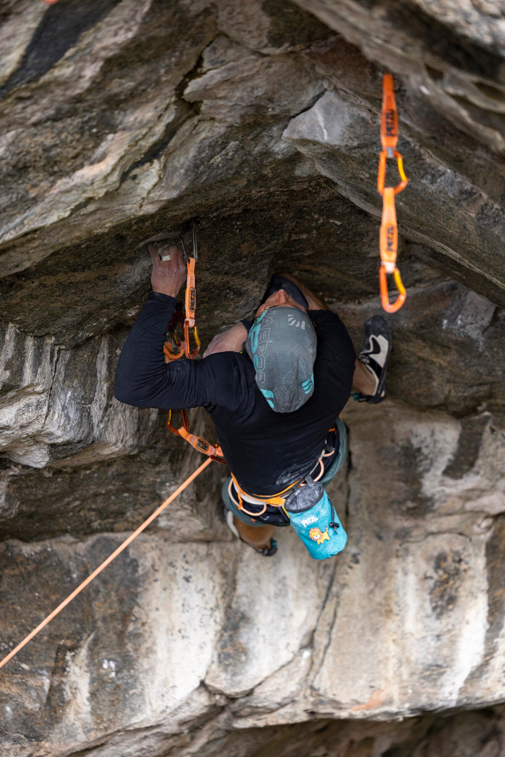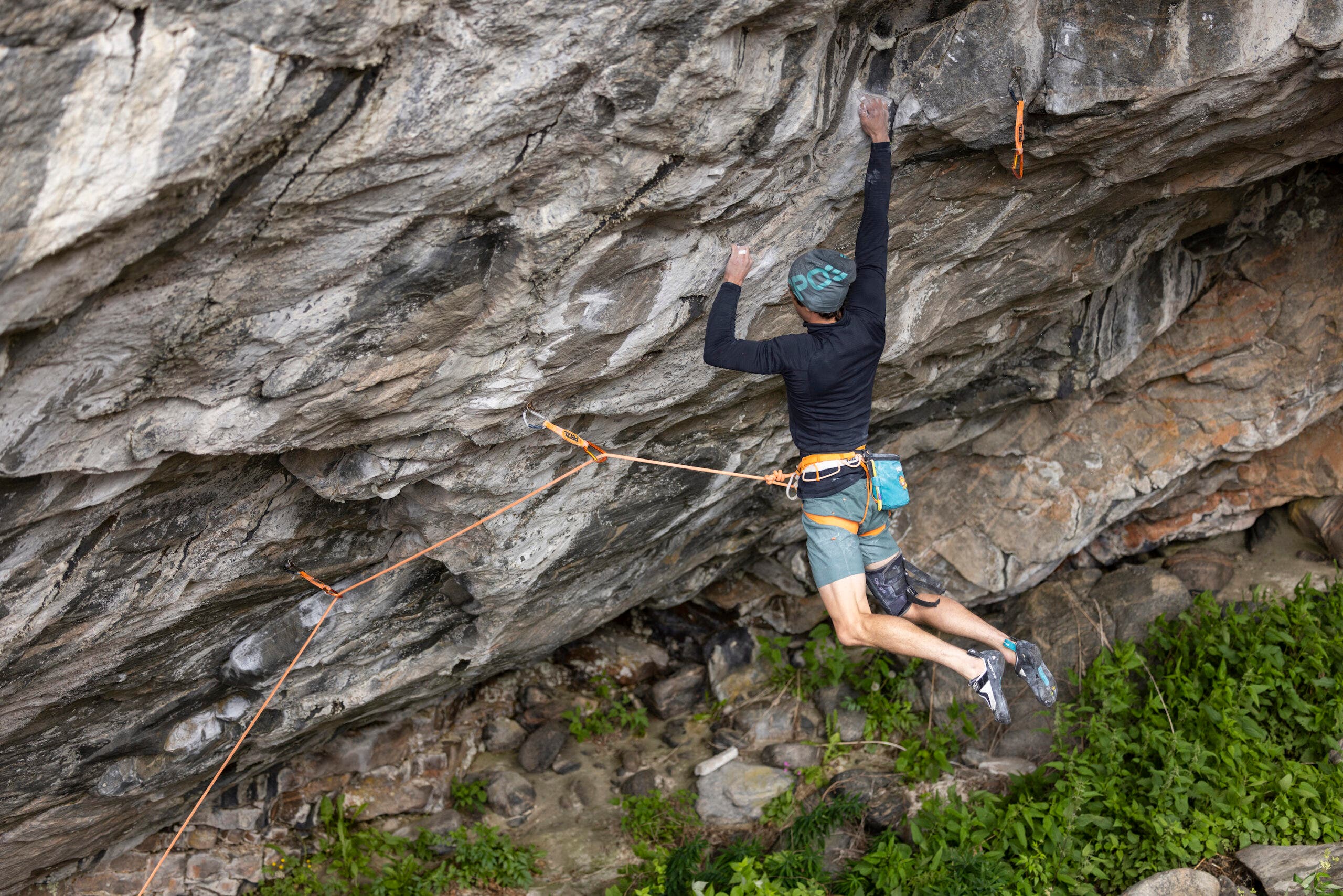 Earlier this summer, Seb Bouin made the third ascent of Change. While Bouin had been crushing in Flatanger this season—repeating 5.15a and making an FA of 5.15b/c—he wasn’t really considering trying Change because it was “too bouldery, too weird, too bad for the shoulder.” But once he saw Swiss climber Alex Rohr working out the crux beta on the lower pitch, Bouin decided to give it a go. He sent the route within a few weeks.