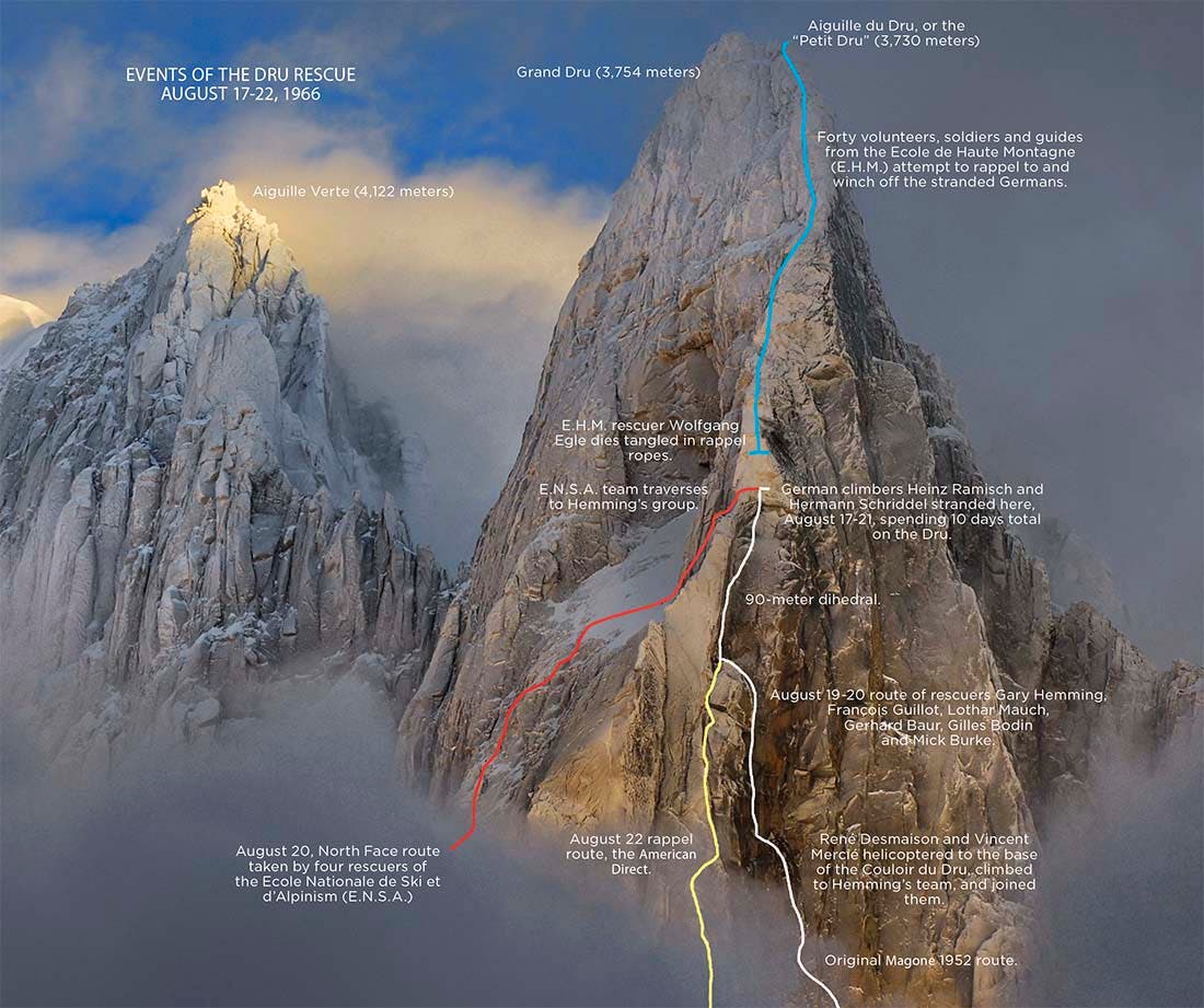 Mauch took a little convincing before he would go with Hemming. “Gary said, ‘If they do it like that, trying to go down from the top of the Dru, they might never get them out.’ He knew very well about the overhangs on the West Face,” he says.