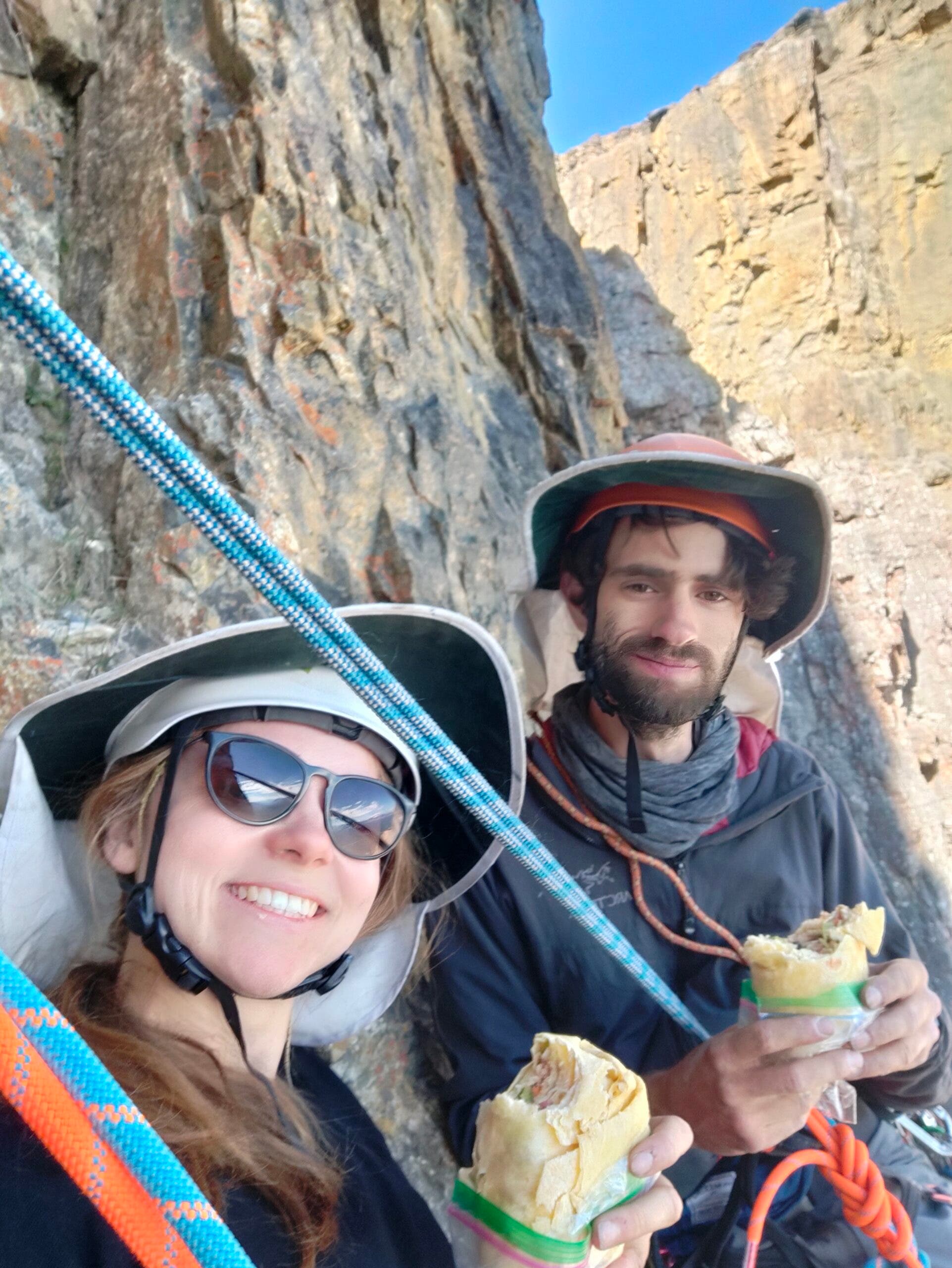 Daniel cruised up the first pitch. He relished the opportunity to use his guide voice to instruct me to not to take videos while he climbed. I followed, and then he was off again on the next pitch. We continued up until eventually arriving at what we believed was the base of pitch five, below a steep corner. It was difficult to determine our exact location since the pitch lengths did not match our guidebook, but we think we worked it out. At this point the climb offered two options, a 5.5 or a 5.8. Daniel decided that the 5.8 route looked more interesting, and since we were making excellent timing, we decided to do this and then have lunch.