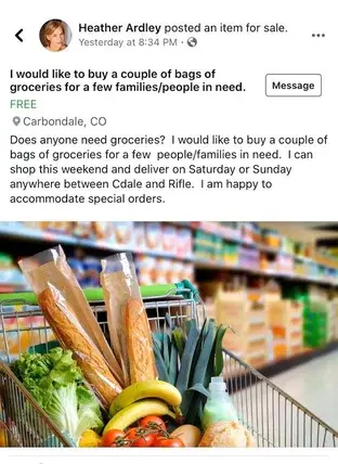 Her version of the post read: “Does anyone need groceries? I would like to buy a couple of bags of groceries for a few people/ families in need. I can shop this weekend and deliver on Saturday or Sunday anywhere between Carbondale and Rifle.”