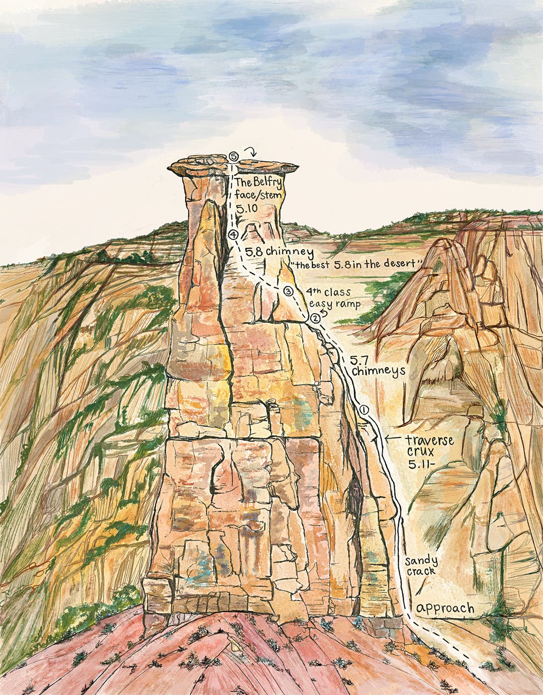 Above the 5.8 chimney lies “The Belfry,” an outrageous final pitch. Creative body English will get you off the belay, followed by guano-covered ledges and the dizzying architecture of the Kissing Couple’s lips, and finally a bodylength of Kayenta caprock. The upper chimney is a bit like being inside the better-known Honeymoon Chimney on the Priest (there must be something tying love and spirituality to the primal fear evoked by hard-to-protect chimneys … ). Still, “The Bell Tower was an excellent climb,” Kor in Desert Rock III was quoted as saying. “One of the few desert first ascents that I later repeated.”