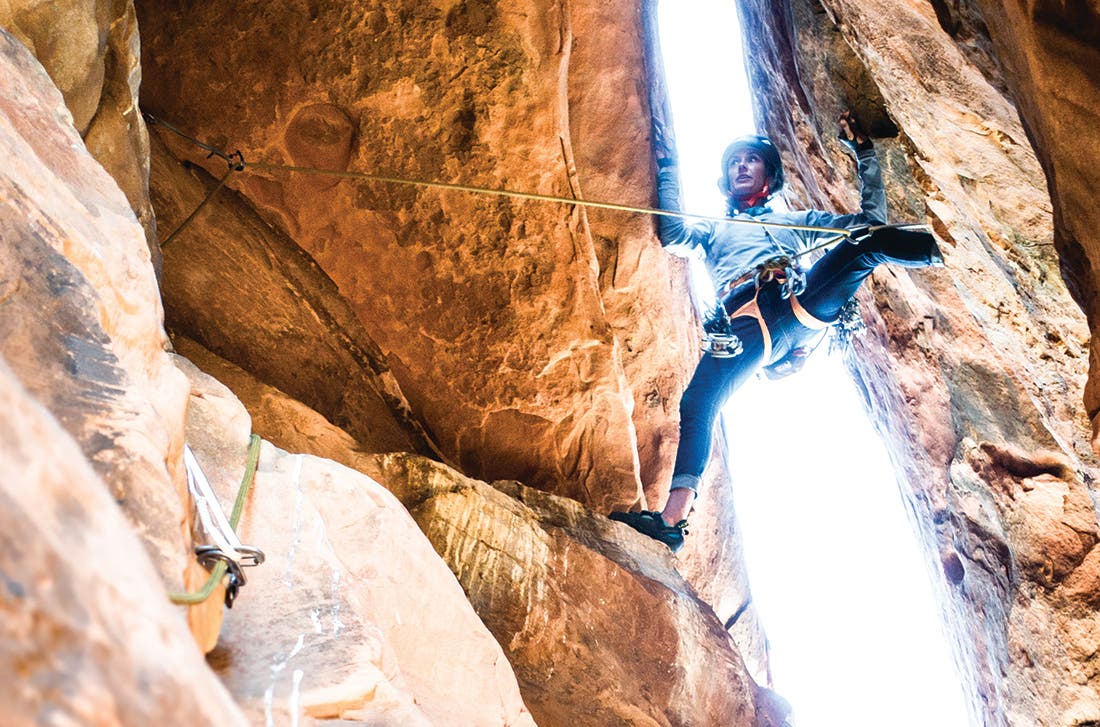 Wedged between an arching column and a smooth wall on Colorado National Monument’s Kissing Couple Tower, I moved up through a sandstone basilica. Past the gigantic flakes and tilted walls, I sensed an emptiness: the breaches in this prehistoric cathedral and the abyss between me and the desert floor, 400 feet below. I’d been here before, back in 2003 when I first climbed the five-pitch Long Dong Wall (III 5.11). Sixteen years later, as I revisited the climb with my wife, Heather, it didn’t feel any easier.