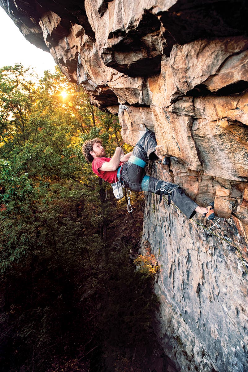 Buffet Wall became my refuge amid the unpredictable Southeast weather. If there’s one thing I’ve learned from cutting my teeth on Chattanooga stone for over four years, it’s that prime conditions are an anomaly. Nevertheless, I’d climb my projects in the dead of summer when the Buffet Wall was shrouded in afternoon shade, even though rattlers and poison ivy peeped through the talus below. And I climbed during torrential downpours thanks to the wall’s capstone roof. On one trip, my friend Kenny and I drove in through thick blankets of fog as we questioned our decision to climb. A few hours later, as tendrils of mist wafted up the wall, Kenny sent Meat and Three (5.12d/13a), an endurance haul with a big move to a tiny gaston guarding a double-kneebar rest above.