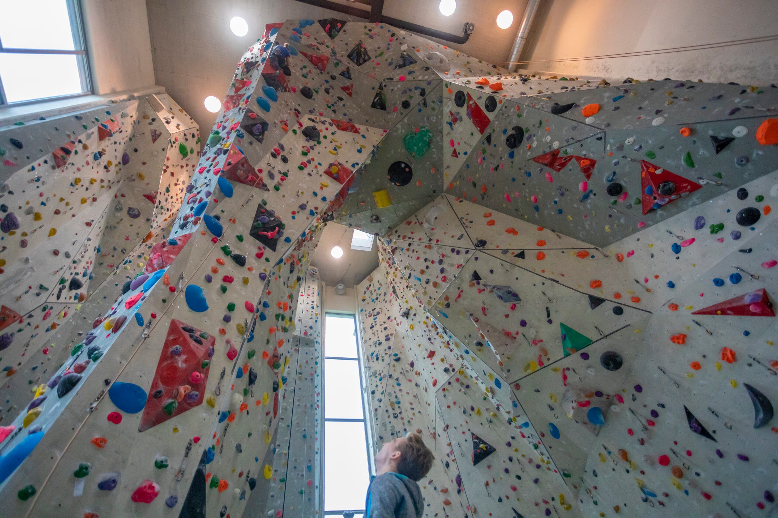 The crew glued rocks onto wooden walls and hung Macrotiles, the textured 18-square-inch hexagonals from Metolius, on one wall.