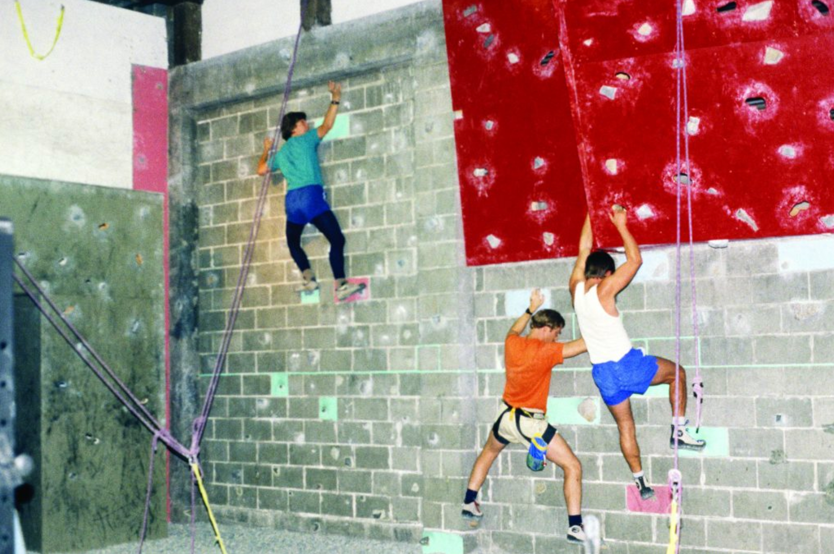 As early as 1975, the University of Washington set up a 40-foot outdoor wall, and though use depended on weather, the facility developed a fast following. Many climbers also “buildered” on college walls or screwed strips of wood to garage walls and crimped on those. In the 1980s, L.A. climbers glued holds onto the concrete of highway underpasses, creating a whole scene.