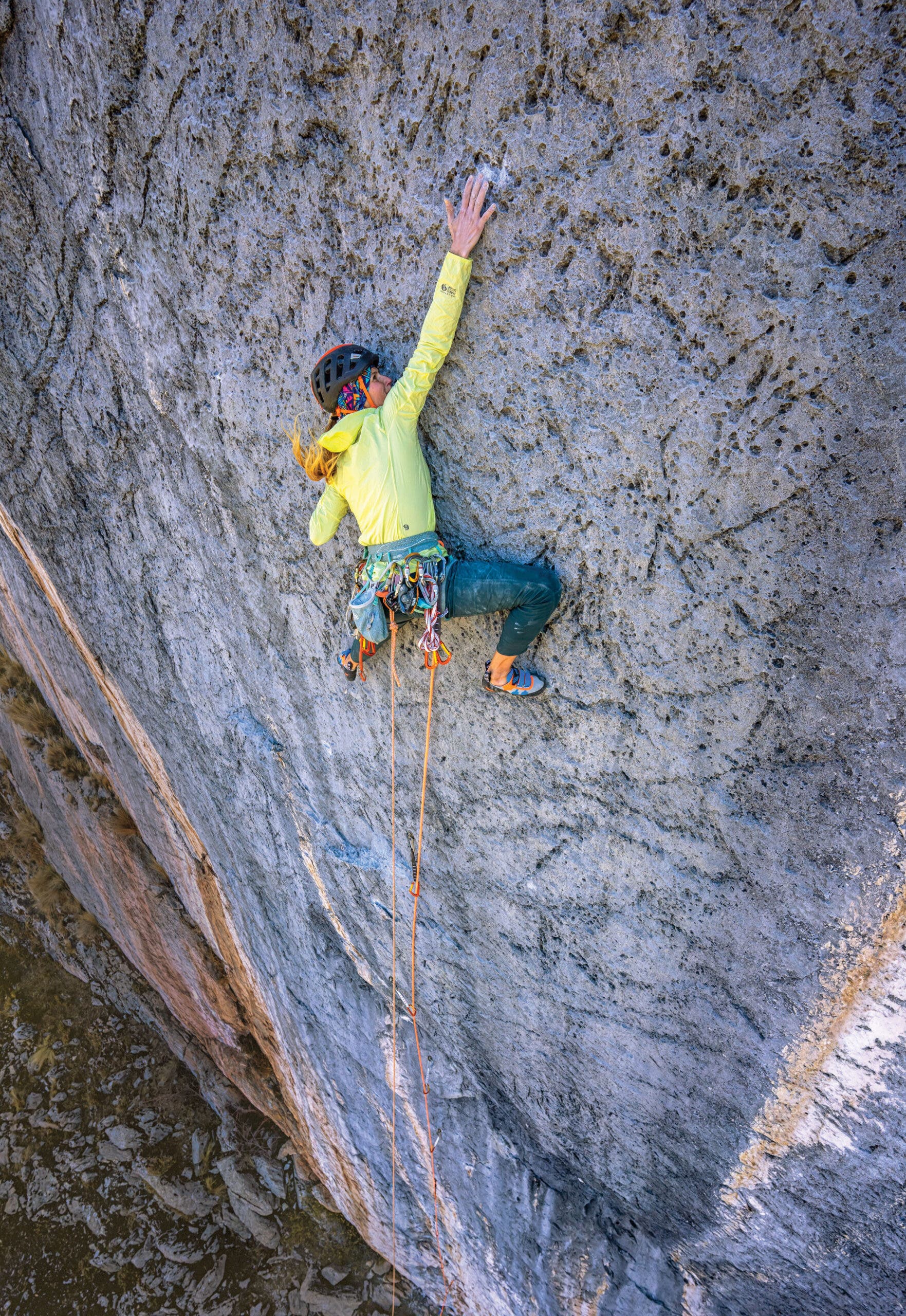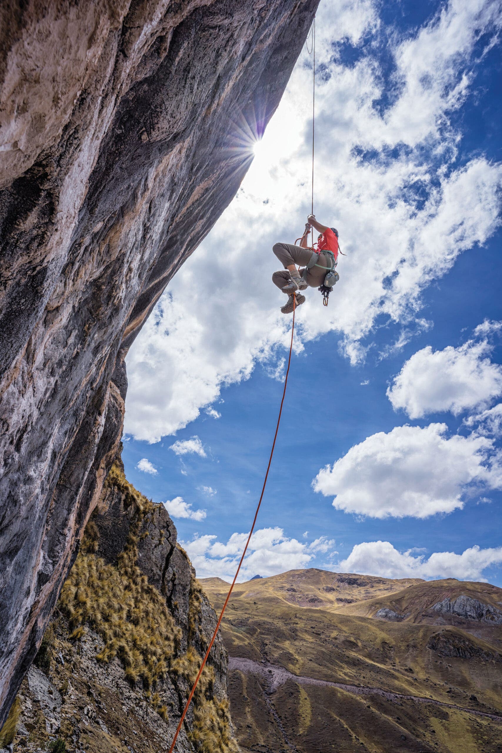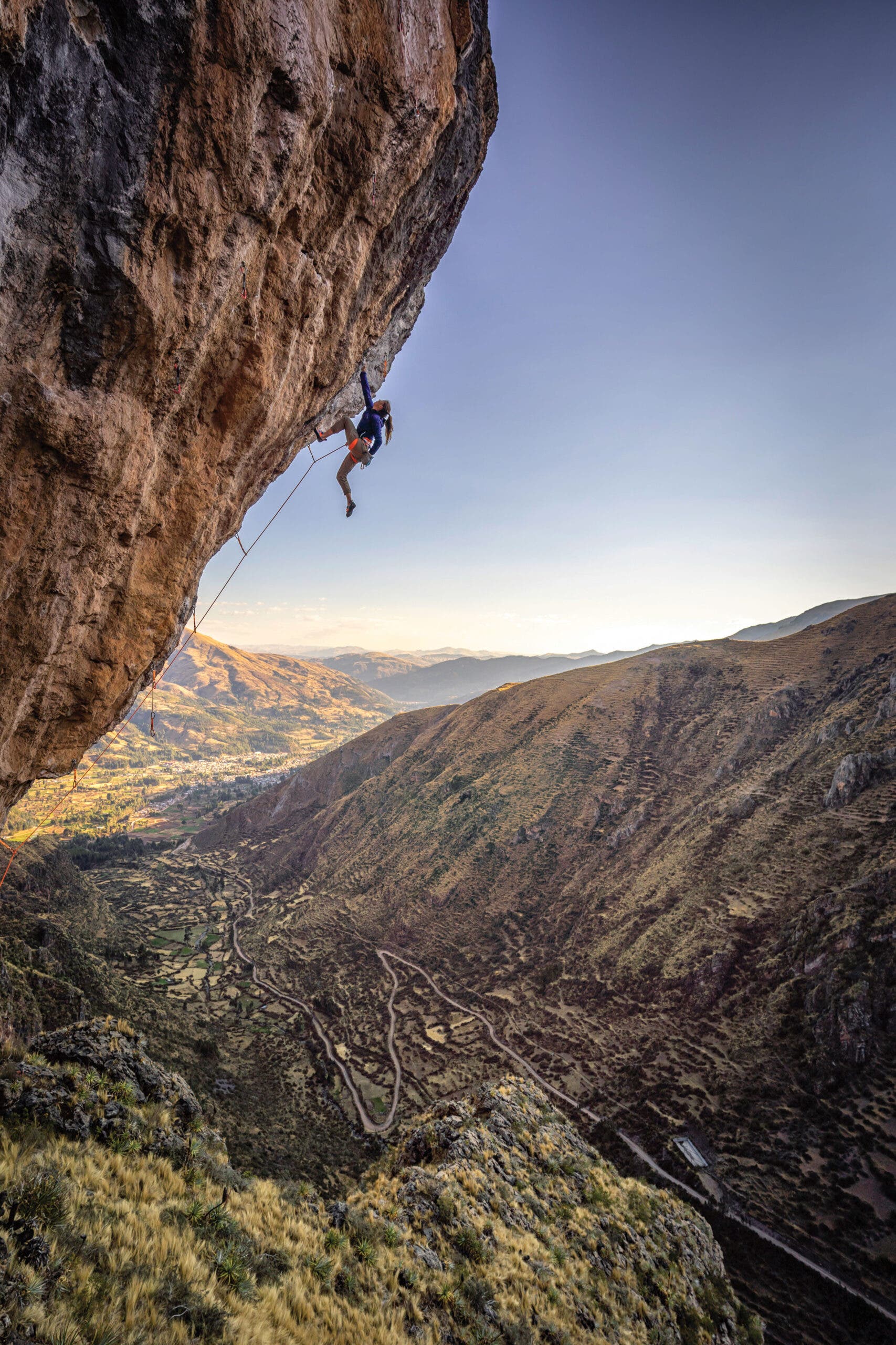 Charlotte Durif punches through the slabby third pitch, a 5.13b rope stretcher, of Vuelo Del Condor, on a wall discovered several hours outside Cusco, Peru, in the highlands of the Andes. “This pitch is all about balance on small holds that are almost never down pulling,” says Durif. (Photo: Jan Novak)