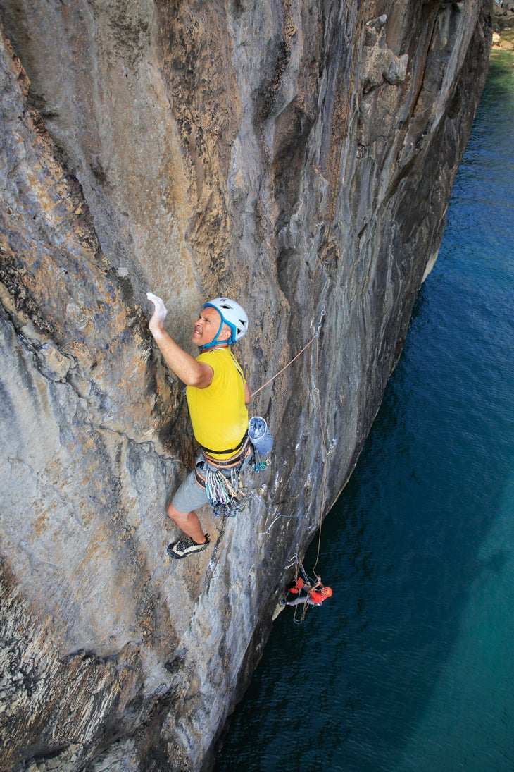 Not surprisingly, Pembroke has become the epicenter of adventure sea-cliff climbing in the United Kingdom. Strangely, it wasn’t always held in such high regard. Sea-cliff maestro Pat Littlejohn, after his visit to the collapsed cave of the Cauldron in 1970, was rumored to have said, “These single-pitch cliffs will never amount to much.” In the 1960s, Jim Perrin had the cunning idea of using a sea kayak to scour the cliffs. Using this approach, he, with Colin Mortlock, unveiled many of the area’s king lines.