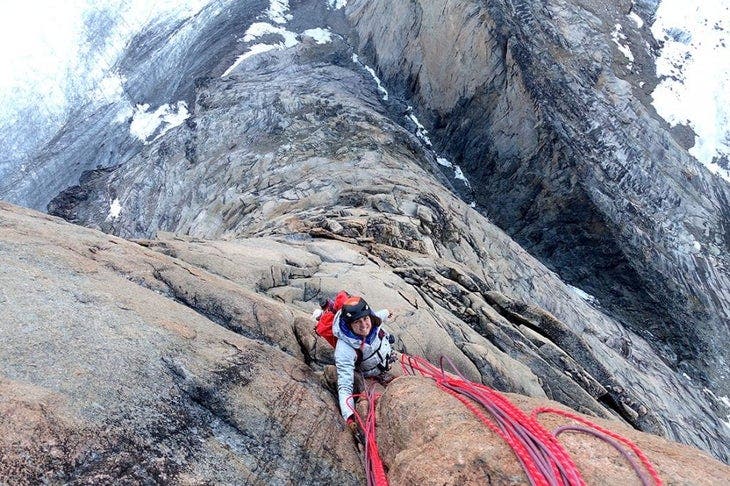 We spent the first day climbing six long pitches of wandery, runout and sometimes terrifying face climbing to navigate our way to the base of the crack. Here we spent the night at a beautifully exposed free-hanging bivy on Grade 7 pods (those new-fangled inflatable portaledge things!).