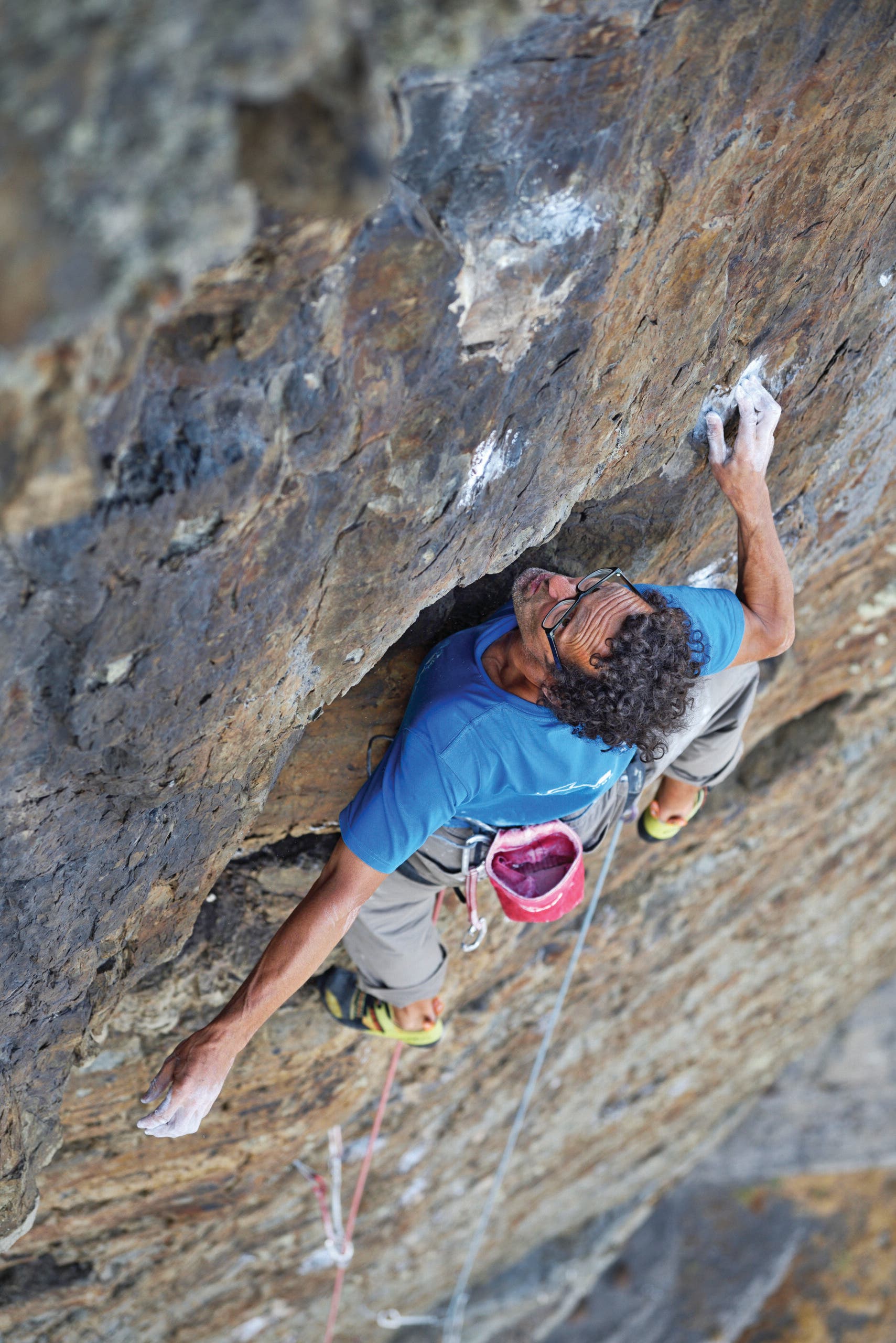 Stepping from the ground, crimping a vein of the orange mold, I had to try three times even to stand on the wall. Up, down, up, down, up, down …. The rock was like nothing I had climbed before, and the amount of gear clipped to my harness felt as heavy as an anchor. What looked like orange mold—bubbled, crozzled, crisp—was not mold-like at all, and it was the color and texture to aim for, although the thin shining strips of white had to be crimped on occasion. The least trustworthy color was gray—mudstone, bloody mudstone, moving like the pulp of a soft pear.
