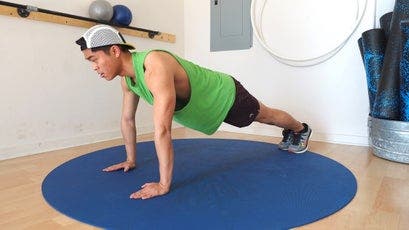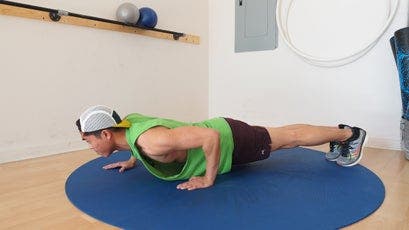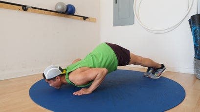 From a standard push-up position, move one hand forward and the other backward so they’re offset by about six to 12 inches (the farther, the more difficult). Bend your elbows to lower your chest until it is slightly below the level of your bent elbow, and then extend your elbows to push back up to the starting position. Keep your elbows tight to your body throughout the movement. After one or more repetitions, switch the fore and aft positions of your hands to work each side evenly.