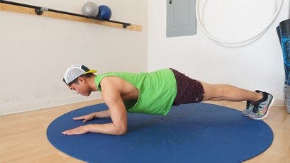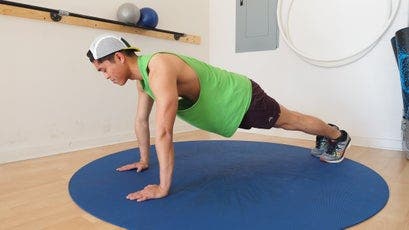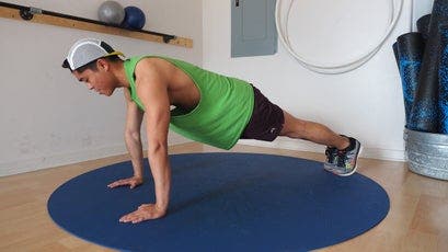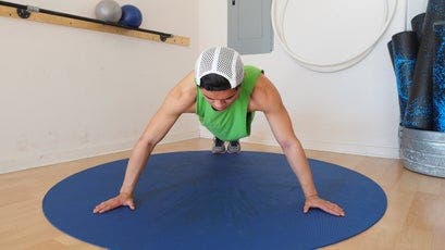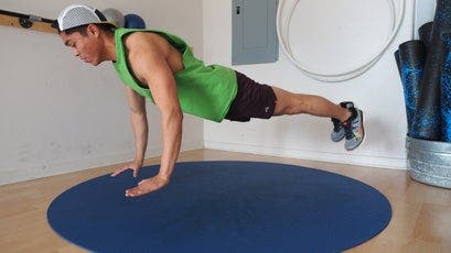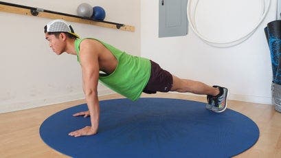 Great push-up form starts with a rigid plank. Your arms should be fully extended, with your hands, elbows, and shoulders all in line, and your feet should be no more than 12 inches apart—the closer together, the more difficult the push-up, because it requires more core activation for stability. Throughout the push-up movement (unless otherwise specified by a variation), your spine should be neutral, so that your body forms a straight line from your feet to the crown of your head. Remember to engage your core and thighs to keep your hips flat and level.