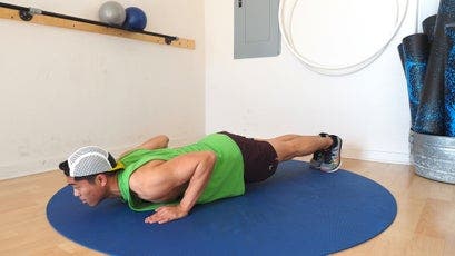 Start in a standard push-up position (as described above), with your feet together or no more than 12 inches apart, hands flat on the ground below your shoulders, and arms straight. Breathe in as you bend your elbows—keep them tracking back alongside your body—to lower your chest to slightly below the level of your bent elbow, and then breathe out as you push back up to the starting position for one repetition.