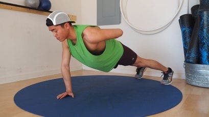 Assume a push-up position, with wide hands angled outward at about 45 degrees. Lower yourself at an angle to one side so that you bring your shoulder down to your hand of the same side, while the other arm stretches to become fully extended. (It’s okay if your hands pivot during the movement.) Push back up to reverse the movement and return to the starting position. Repeat to the other side. It might help to keep your feet wider.