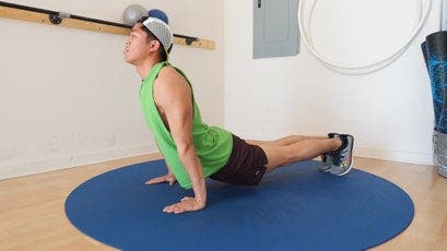 Slowly swoop from downward dog to cobra pose: from the downward dog position, bend your elbows and lower your nose to the floor between your hands, like a pike push-up, but then, without rising, continue moving your torso forward to slide your chin, chest, and then rib cage between your hands. As your ribs meet your hands, begin to arc your head and torso upward. Continue this upward arc until your arms are straight, hips are pressed toward the ground, and your back is hyperextended in cobra pose. Reverse the movement exactly until you’re back in downward dog.