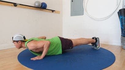 Start in a plank position, with your forearms flat on the ground, shoulder-width apart and parallel. Push up with your triceps to lift your elbows off the ground; continue until your arms are fully extended, then lower your elbows until just above the ground (don’t weight your forearms again) for one repetition. The farther forward you place your arms, the more difficult.