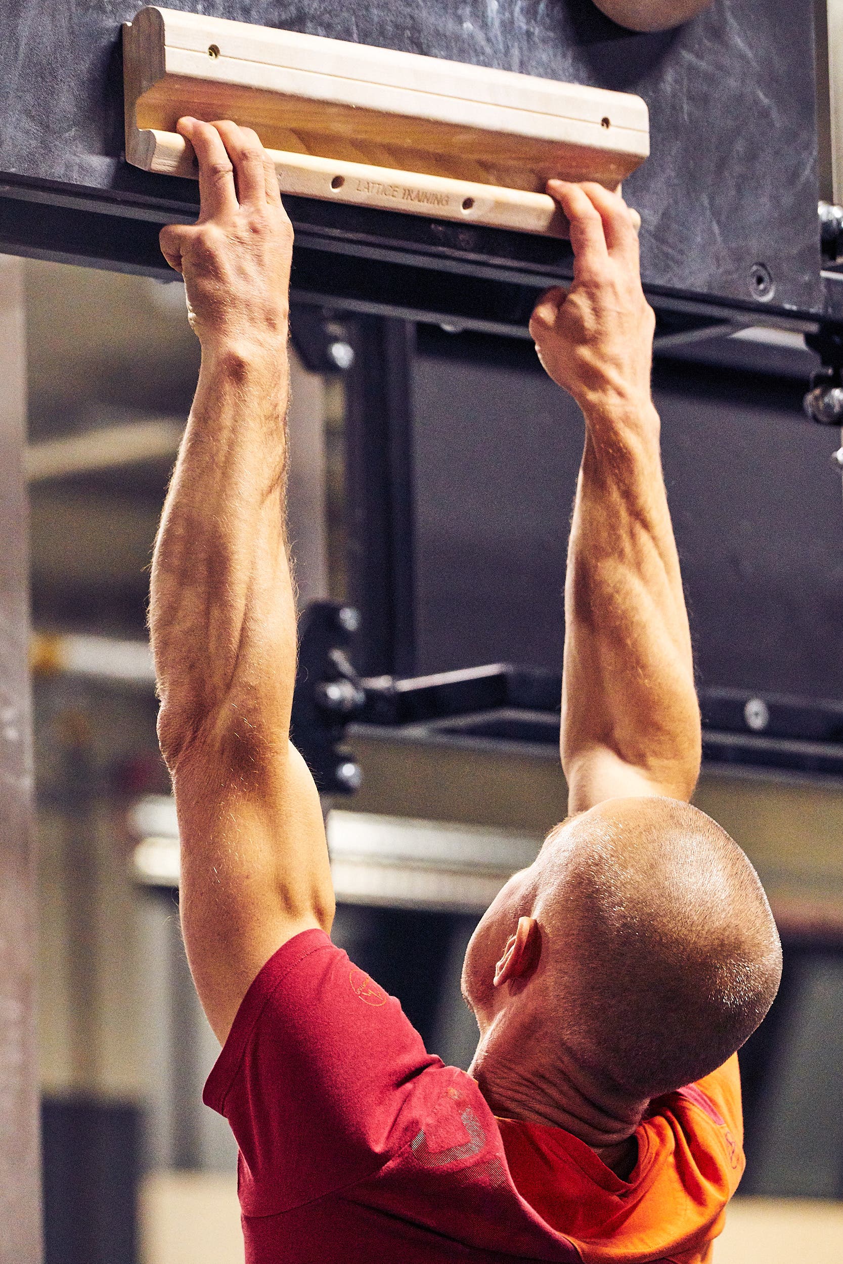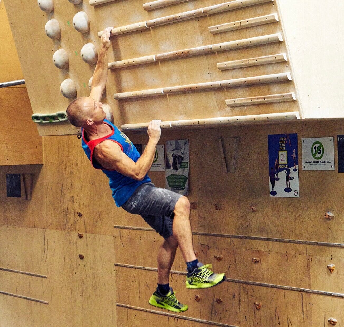 It’s nearly always your fingers that give out first when you climb, so why not train on the pull-up bar afterward? A good strategy is to do high-rep, low-load sets (eg, two-arm pull-ups and leg-raises) after endurance-based climbing and low-rep, high-load sets for strength (eg, offset pull-ups and front-levers) after hard bouldering.