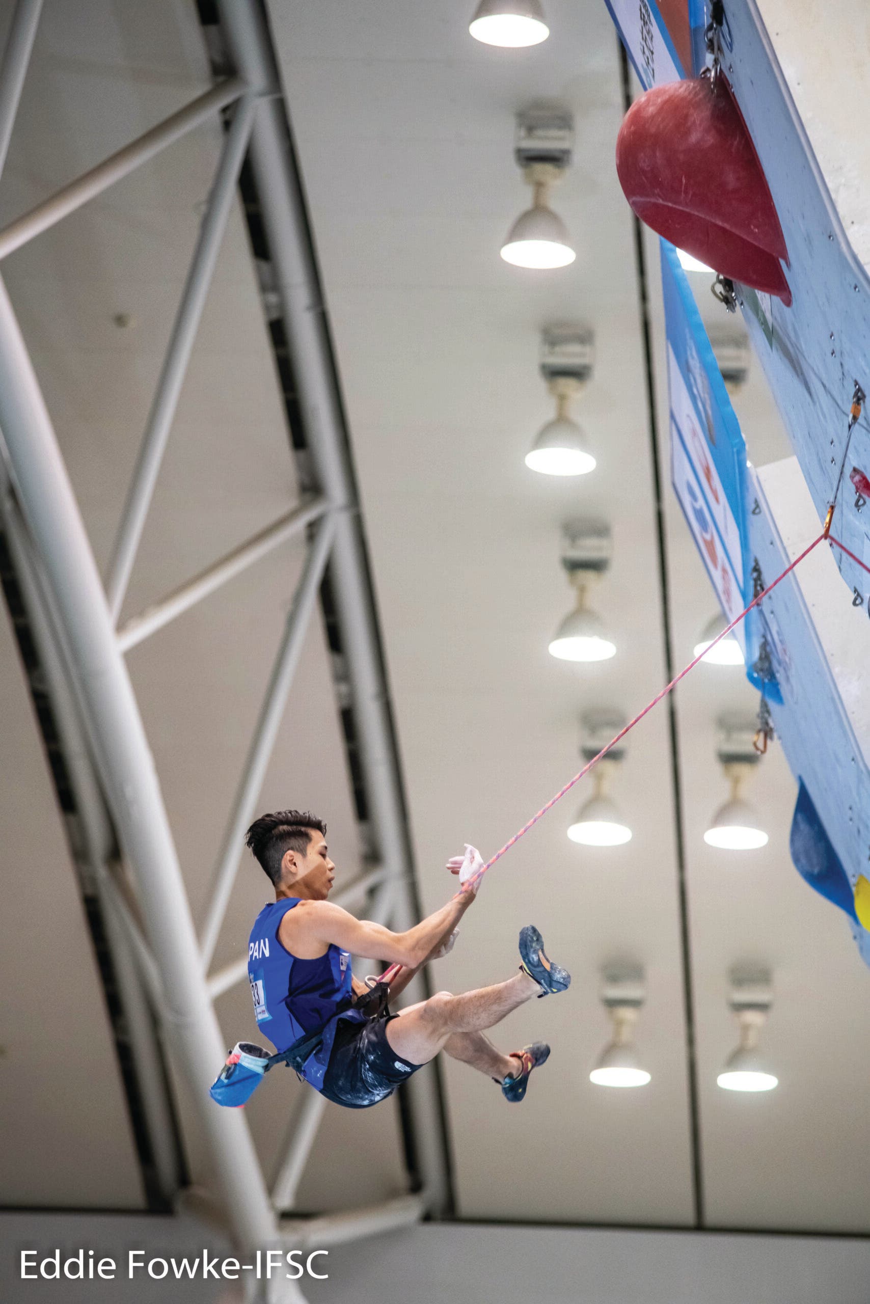 Akiyo Noguchi (JPN) mid-whip at the 2019 Xiamen Lead World Cup. (Photo: Eddie Fowke / IFSC)