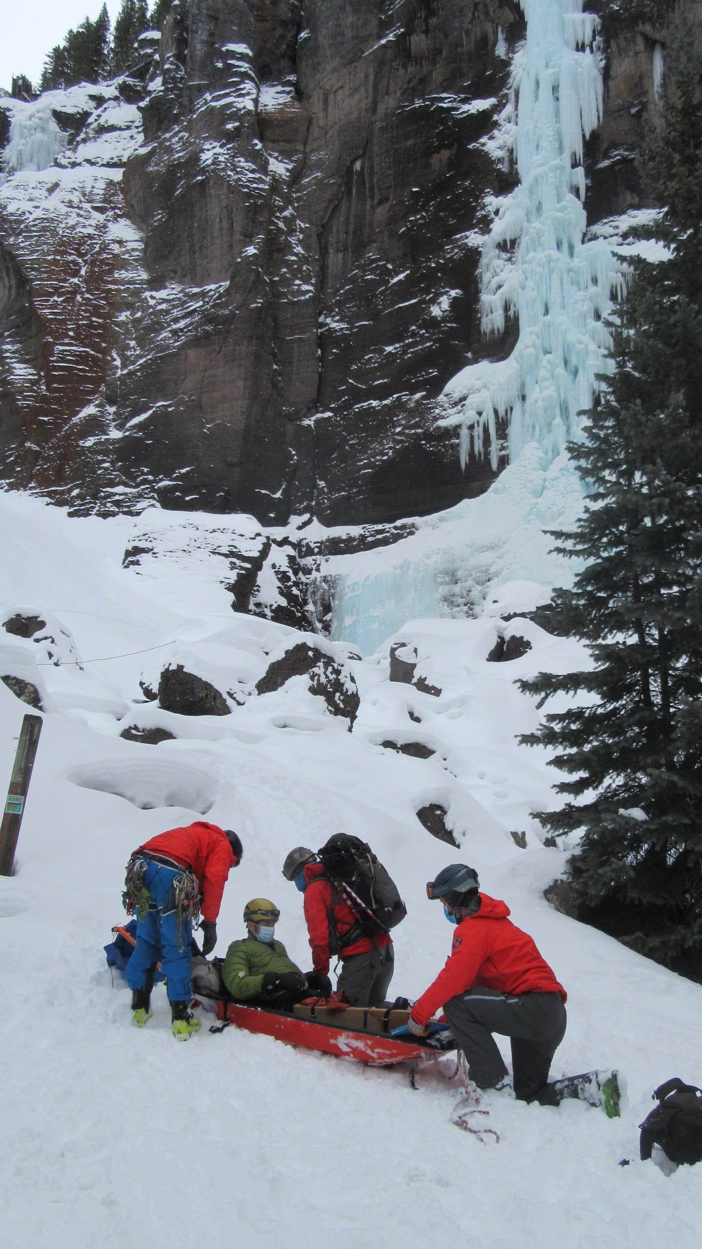 After butt scootching/crutching with my ski poles 500 feet down the snow cone and back to the access road, I sat on my pack for 45 minutes until Rector and several other SAR members arrived on snowmobiles. Rector dragged me out on a litter behind his sled and Bo rode back on a different snowmobile. An hour later, at Telluride Medical Center, the Emergency Room physician ordered an X-Ray and confirmed that I had snapped my fibula and likely blown up all the ligaments in my ankle. The next day I was in surgery.